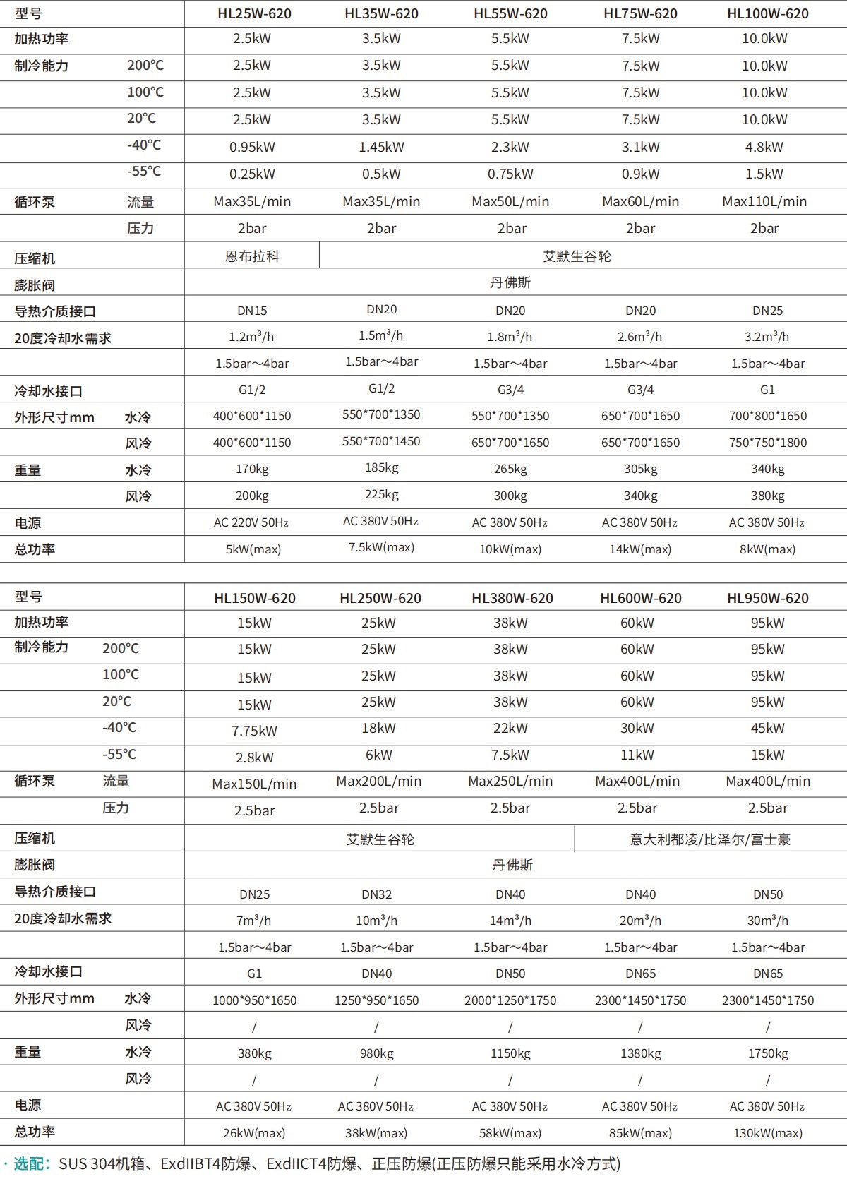 | 型號 | 加熱功率 | 制冷能力 | 循環泵 | 壓縮機 | 膨脹閥 | 導熱介質接口 | 20度冷卻水需求 | 冷卻水接口 | 外形尺寸mm | 重量 | 電源 | 總功率 | ||||||||