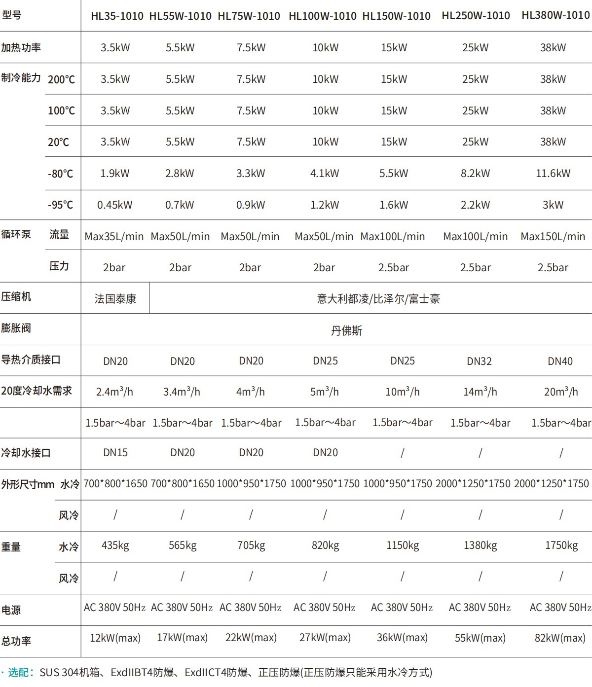 | 型號 | 加熱功率 | 制冷能力 | 循環泵 | 壓縮機 | 膨脹閥 | 導熱介質接口 | 20度冷卻水需求 | 冷卻水接口 | 外形尺寸mm | 重量 | 電源 | 總功率 | |||||||